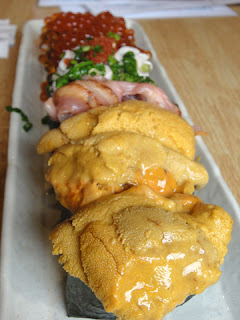 O sushi vem com as ovas transbordando. As fatias dos peixes são tão grande que nem dá ver o shari (bolinho de arroz).De início parece ser bem enjoativo, mas como os ingredientes estão bem frescos o sabor continua agradável. Posso descrever que é macio, suculento e as vezes até adocicado.